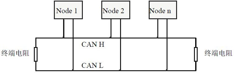 為了增強CAN通訊的可靠性,消除CAN總線終端信號反射干擾,CAN總線網(wǎng)絡最遠的兩個端點通常要加入終端匹配電阻,如圖所示。終端匹配電阻的值由傳輸電纜的特性阻抗所決定。例如雙絞線的特性阻抗為120Ω,則總線上的兩個端點也應集成120Ω終端電阻。如果網(wǎng)絡上其他節(jié)點使用不同的收發(fā)器,則終端電阻須另外計算。