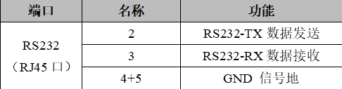 GCAN-GT-413模塊的232串行接口由1路RJ45接口引出,可以用于連接1個RS232設備,其接口定義如表所示。