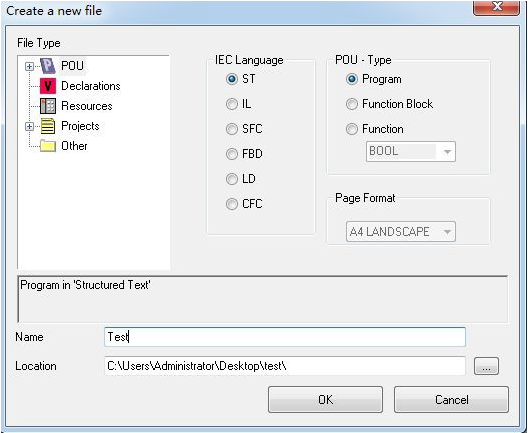 為項目添加文件(例如:添加ST語言編寫的程序頁ST,Program),如圖所示。請注意,Name(名稱)一欄中填入的字符串不能以數(shù)字為開頭。