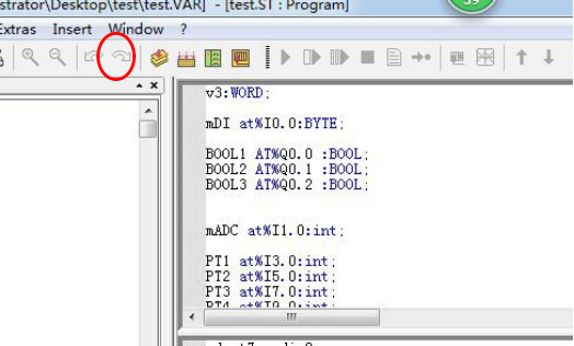 完成變量定義后便可在下方的編程界面開始編程了,下面為用ST編寫的簡單例程語句: