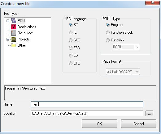 為項(xiàng)目添加文件(例如:添加ST語(yǔ)言編寫的程序頁(yè)ST,Program),如圖所示。請(qǐng)注意,Name(名稱)一欄中填入的字符串不能以數(shù)字為開(kāi)頭。