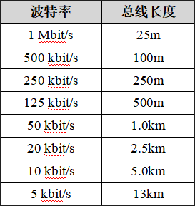 波特率與最大總線長(zhǎng)度參照表