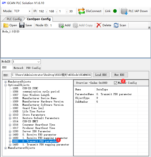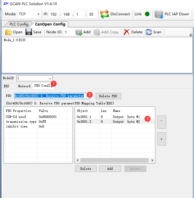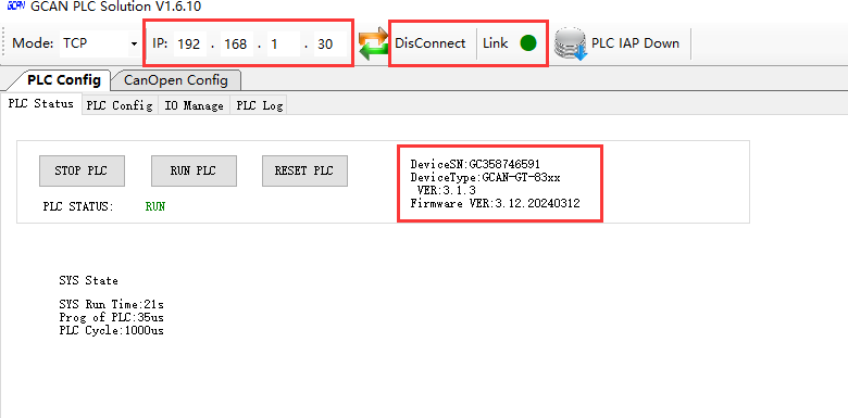 8321的以太網(wǎng)口連接至上位機(jī),CAN口連接從站4032,打開上位機(jī)軟件GCAN_PLC_Solution:默認(rèn)IP,使用以太網(wǎng)接口連接8321設(shè)備: