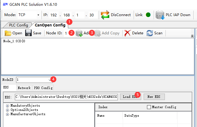 打開CANopen配置頁(yè)面,添加4032對(duì)應(yīng)節(jié)點(diǎn)id,導(dǎo)入4032的eds文件: