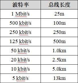 請(qǐng)注意:CAN-bus電纜可以使用普通雙絞線、屏蔽雙絞線。理論最大通信距離主要取決于總線波特率,最大總線長度和波特率關(guān)系詳見下表。若通訊距離超過1km,應(yīng)保證線的截面積大于Φ1.0mm2,具體規(guī)格應(yīng)根據(jù)距離而定,常規(guī)是隨距離的加長而適當(dāng)加大。