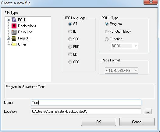 為項(xiàng)目添加文件(例如:添加ST語言編寫的程序頁ST,Program),如圖所示。請(qǐng)注意,Name(名稱)一欄中填入的字符串不能以數(shù)字為開頭。