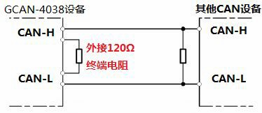 請注意:GCAN-4038模塊內(nèi)部未集成120Ω終端電阻。如果節(jié)點數(shù)目大于2,中間節(jié)點不需要安裝120Ω的終端電阻。需要使用時,將電阻兩端分別接入CAN_H、CAN_L即可,如圖所示。