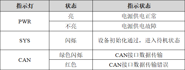 GCAN-4038模塊具有1個PWR指示燈、1個SYS指示燈、1個CAN指示燈來指示設備的運行狀態(tài)。這3個指示燈的具體指示功能及狀態(tài)如下表所示。