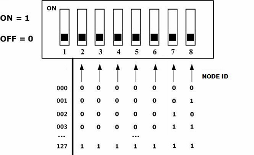 如圖下圖所示,撥碼開關的每個位撥向“ON“位置時,該位為“1”,如果撥向“OFF”位置,則該位為“0”。撥碼開關的2-8位用于設定模塊的節(jié)點號(NODE ID),第八位為最低位,第二位為最高位,模塊的節(jié)點號(NODE ID)是各位對應的十進制值之和,通過撥碼開關設定模塊的節(jié)點號(NODE ID)的有效范圍為0~127。