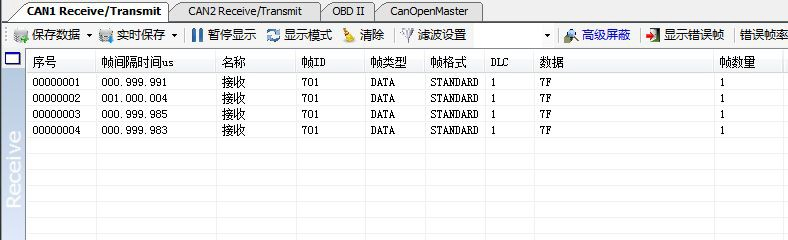 例如:通過撥碼開關設置GCAN-4038的Node ID為1(以下節(jié)點號均為1),則USBCAN-II Pro作為主站設備可接收到一條節(jié)點狀態(tài)數(shù)據(jù),幀ID為0x701,幀數(shù)據(jù)為0x7F。如圖5.1所示,使用ECANTools軟件可以收到這條數(shù)據(jù)。