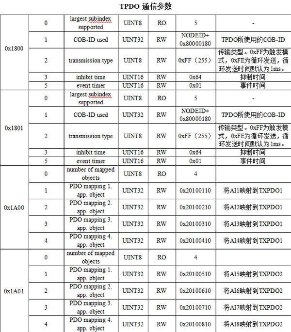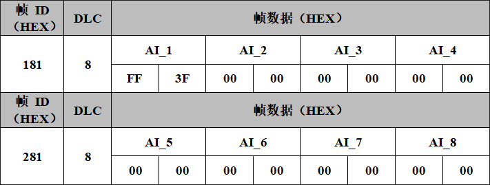 例如,GCAN-4038模塊節(jié)點號設為1。若目前端口形式為默認的-10V~+10V,若通道1輸入的電壓為5V,則對應數(shù)字量為16383,轉(zhuǎn)換為16進制是3FFF,又因為數(shù)據(jù)傳輸中低位在前高位在后,所以數(shù)據(jù)為FF 3F。若其余通道均無輸入,則TPDO1命令的幀ID為0x181,數(shù)據(jù)長度(DLC)為8,幀數(shù)據(jù)為FF 3F 00 00 00 00 00 00。TPDO2命令的幀ID為0x281,數(shù)據(jù)長度(DLC)為8,幀數(shù)據(jù)為00 00 00 00 00 00 00 00。