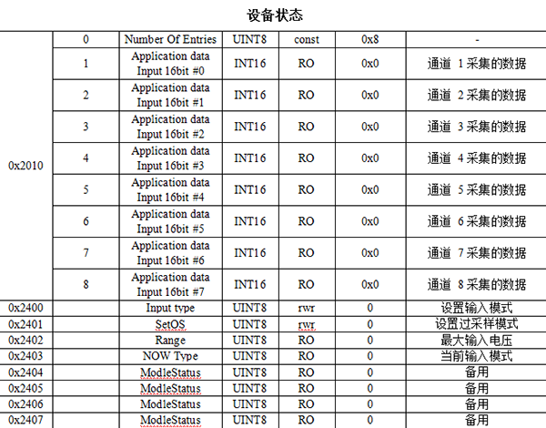 GCAN-4038模塊采用PDO(Process Data Object,過程數(shù)據(jù)對象)對模擬量信號進行采集。其中,TPDO用于表示模擬量采集目前的狀態(tài),共有2個TPDO.其中TPDO1代表前4個通道,TPDO2代表后4個通道。模擬量采集狀態(tài)每個通道由兩個字節(jié)來表示,TPDO1的第一第二字節(jié)表示通道1;第三第四字節(jié)表示通道2;第五第六字節(jié)表示通道3;第七第八字節(jié)表示通道4;TPDO2的第一第二字節(jié)表示通道5;第三第四字節(jié)表示通道6;第五第六字節(jié)表示通道7;第七第八字節(jié)表示通道8。模擬量采集共支持3種形式:-5V~+5V,-10V~+10V,-20mA~+20mA;但并不是同時支持。具體支持哪種形式需要通過SDO設定。默認為-10V~+10V。
