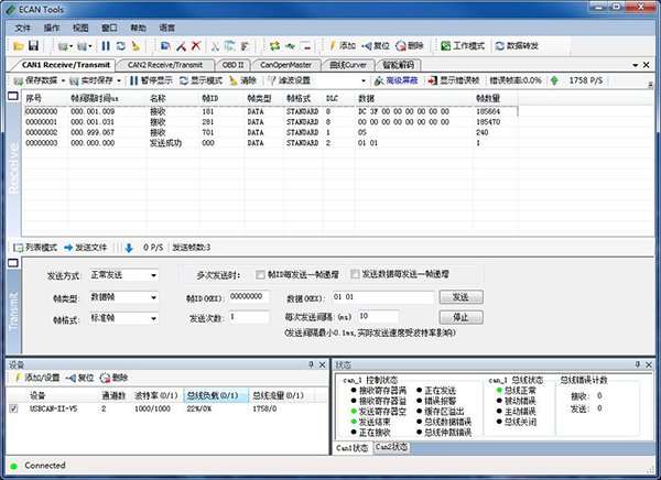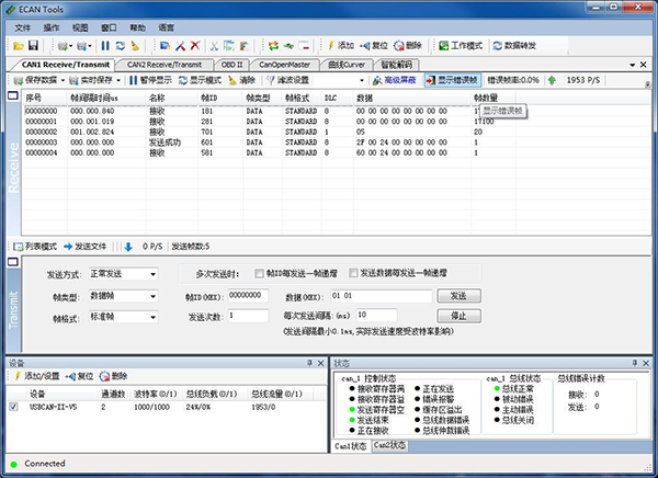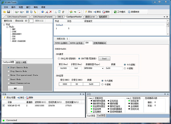 本章將使用廣成科技USBCAN-II Pro模塊及ECANTools軟件可以進行CAN總線數(shù)據(jù)的接收與發(fā)送。軟件附帶的CANopen主站功能可以幫助調(diào)試CANopen從站,非常的方便實用。