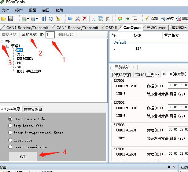 GCAN-4055模塊接收由主站發(fā)出的操作指令,幀ID為0x000,DLC為2,幀數(shù)據(jù)第一個(gè)字節(jié)為命令符,第二個(gè)字節(jié)為節(jié)點(diǎn)號(hào)(若為00則控制全部節(jié)點(diǎn))。例如:GCAN-4055的Node ID為1,命令GCAN-4055為進(jìn)入操作狀態(tài)(01),則NMT命令幀ID為0x000,幀數(shù)據(jù)為0x01,0x01。該命令也可由ECANTools軟件的CANopen插件發(fā)出。