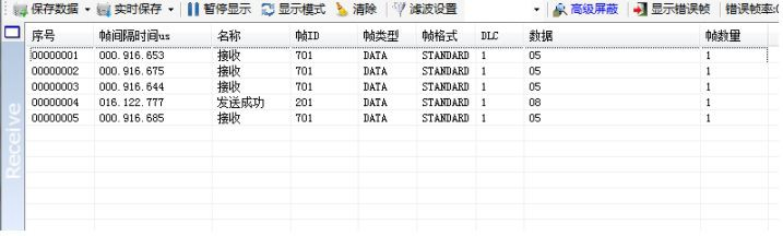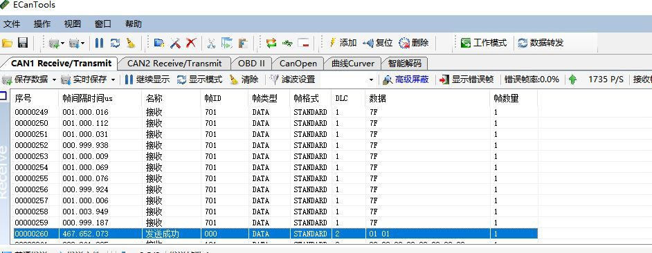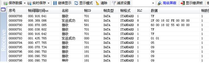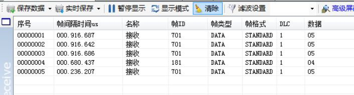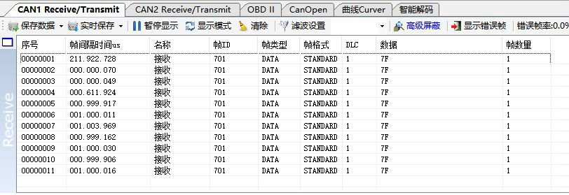 例如:通過撥碼開關(guān)設(shè)置GCAN-4055的Node ID為1(以下節(jié)點(diǎn)號(hào)均為1),則USBCAN-II Pro作為主站設(shè)備可接收到一條節(jié)點(diǎn)狀態(tài)數(shù)據(jù),幀ID為0x701,幀數(shù)據(jù)為0x7F,默認(rèn)循環(huán)時(shí)間為1s(對(duì)象字典0x100C,節(jié)點(diǎn)守護(hù)時(shí)間)。如圖所示,使用ECANTools軟件可以收到這條數(shù)據(jù)。