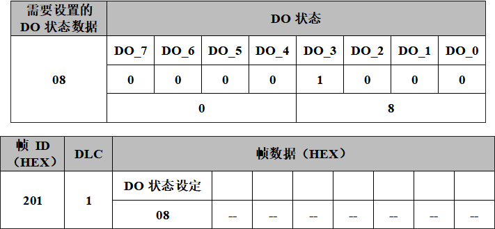 例如,GCAN-4055模塊節(jié)點(diǎn)號(hào)設(shè)為1。若需要設(shè)置DO_3狀態(tài)為1,其余DO狀態(tài)均為0,則RPDO1命令的幀ID為0x201,數(shù)據(jù)長度(DLC)為1,幀數(shù)據(jù)為0x08。