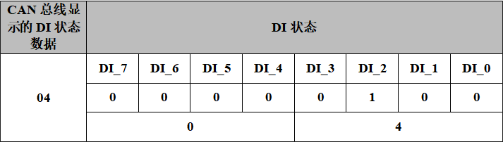 數(shù)字量輸入和數(shù)字量輸出的狀態(tài)均各由一個(gè)字節(jié)來表示,DI_7和DO_7在高位,DI_0和DO_0在低位。