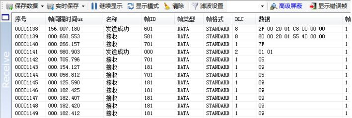 如圖所示,在ECANTools軟件的CANopen插件中,點(diǎn)擊左側(cè)的“PDO”,之后選取右側(cè)的“RXPDO(主發(fā)送)”,在RXPDO1中修改數(shù)據(jù)為08,點(diǎn)擊發(fā)送即可控制DO_3的狀態(tài)為1。如圖,回到收發(fā)界面(Receive/Transmit)可以看到USBCAN-II Pro發(fā)出的RPDO1命令(幀ID為0x201)。