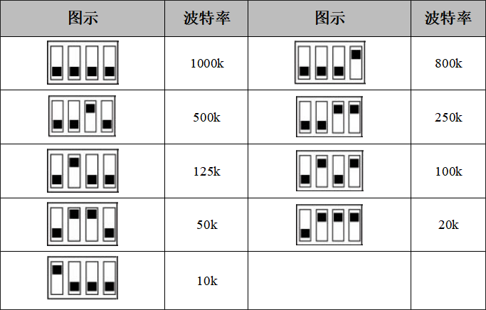 右側(cè)撥碼開關(guān)的1-4位用于設(shè)定模塊的波特率,第一位為低位,第四位為高位。波特率與開關(guān)設(shè)置對(duì)應(yīng)值如下表所示。