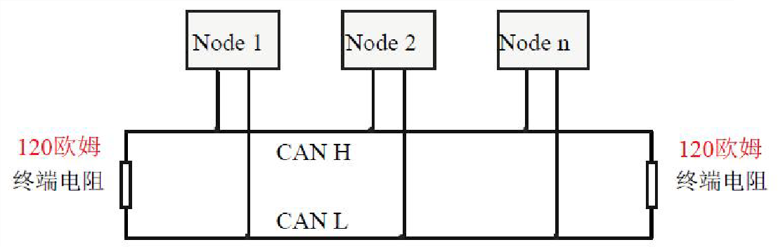 為了增強(qiáng)CAN通訊的可靠性,消除CAN總線終端信號(hào)反射干擾,CAN總線網(wǎng)絡(luò)最遠(yuǎn)的兩個(gè)端點(diǎn)通常要加入終端匹配電阻,如圖所示。終端匹配電阻的值由傳輸電纜的特性阻抗所決定。例如雙絞線的特性阻抗為120Ω,則總線上的兩個(gè)端點(diǎn)也應(yīng)集成120Ω終端電阻。如果網(wǎng)絡(luò)上其他節(jié)點(diǎn)使用不同的收發(fā)器,則終端電阻須另外計(jì)算。