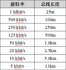 請(qǐng)注意:CAN-bus電纜可以使用普通雙絞線、屏蔽雙絞線。理論最大通信距離主要取決于總線波特率,最大總線長度和波特率關(guān)系詳見下表。若通訊距離超過1km,應(yīng)保證線的截面積大于Φ1.0mm2,具體規(guī)格應(yīng)根據(jù)距離而定,常規(guī)是隨距離的加長而適當(dāng)加大。