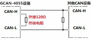 請(qǐng)注意:GCAN-4055模塊內(nèi)部未集成120Ω終端電阻。如果節(jié)點(diǎn)數(shù)目大于2,中間節(jié)點(diǎn)不需要安裝120Ω的終端電阻。需要使用時(shí),將電阻兩端分別接入CAN_H、CAN_L即可,如圖所示。