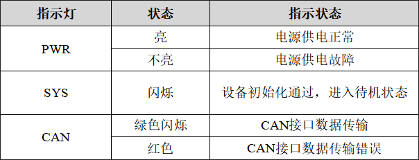 GCAN-4055模塊具有1個(gè)PWR指示燈、1個(gè)SYS指示燈、1個(gè)CAN指示燈來指示設(shè)備的運(yùn)行狀態(tài)。這3個(gè)指示燈的具體指示功能及狀態(tài)如表所示。