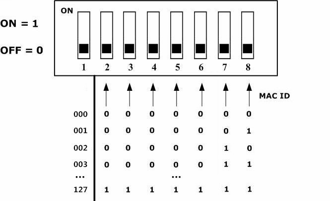 如圖所示,撥碼開關(guān)的每個(gè)位撥向“ON“位置時(shí),該位為“1”,如果撥向“OFF”位置,則該位為“0”。撥碼開關(guān)的2-8位用于設(shè)定模塊的節(jié)點(diǎn)號(hào)(MAC ID),第八位為最低位,第二位為最高位,模塊的節(jié)點(diǎn)號(hào)(MAC ID)是各位對(duì)應(yīng)的十進(jìn)制值之和,通過撥碼開關(guān)設(shè)定模塊的節(jié)點(diǎn)號(hào)(MAC ID)的有效范圍為0~127。