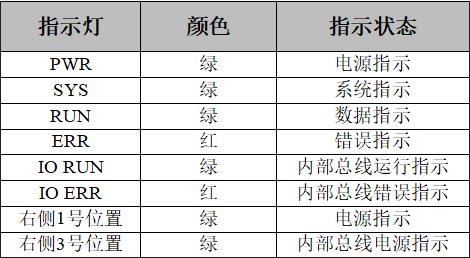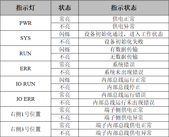 GCAN-8100 Modbus總線耦合器具有兩組狀態(tài)指示燈。左側(cè)區(qū)域包含6個(gè)圓形狀態(tài)指示燈,右側(cè)區(qū)域包含2個(gè)小型電源指示燈。指示燈的具體指示功能見下表。指示燈處于不同狀態(tài)下時(shí),GCAN-8100模塊狀態(tài)如下表所示。
