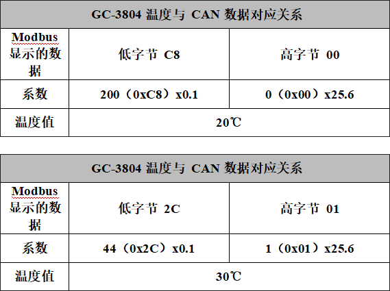 當(dāng)搭載GC-3804模塊(4路PT100模擬量輸入)時(shí),GCAN-8100會(huì)將AI數(shù)據(jù)存放與Modbus模擬量輸入寄存器中,您可以通過04功能碼進(jìn)行讀取。