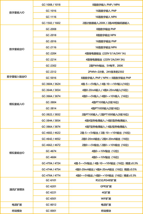 (5)在電源供應充足情況下可擴展IO模塊數量最多為32個(最多32x8個DI/DO點);其中當擴展模塊數量超過16片時,需額外增加一片上述的IO供電擴展模塊GC 8012以保證電源供應充足;