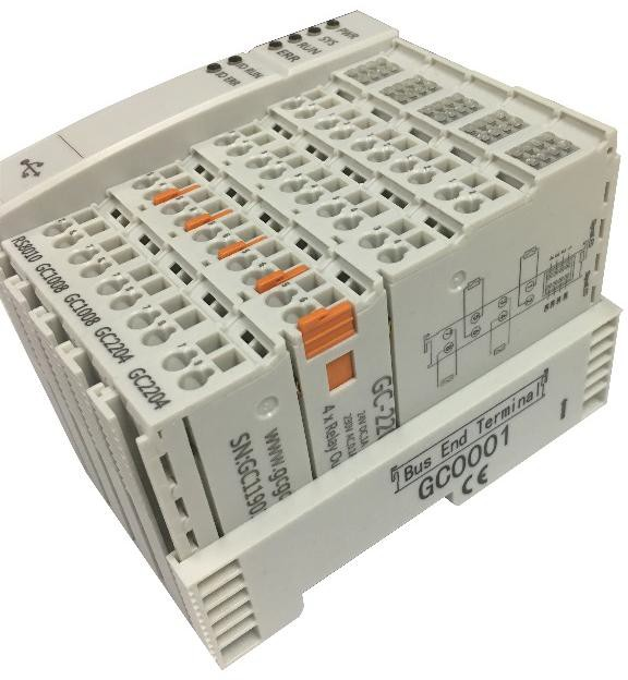 GCAN-PLC-510系列產品由一個可編程的主控模塊(GCAN-PLC-510)、若干GC系列IO模塊以及一個終端電阻模塊(GC-0001)組成。GCAN-PLC-510等主控模塊可連接所有的GC系列IO模塊,用戶可根據現場實際需求自行選擇擴展IO模塊,在電源供應充足情況下,IO模塊數量最多可擴展32個,其中當擴展模塊數量超過16片時,需額外增加一片IO供電擴展模塊GC 8012以保證電源供應充足,主控模塊可根據插入IO模塊的前后位置自動分配地址,實現自動組態(tài),用戶無需在PC上創(chuàng)建組態(tài)界面及設置參數。