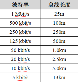波特率與最大總線長度參照表