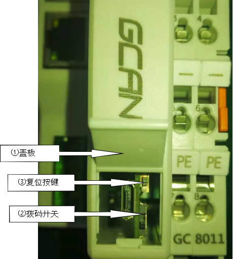 GCAN-PLC-510提供1個程序運行開關和1個復位按鈕。打開蓋板后實物圖如圖所示。