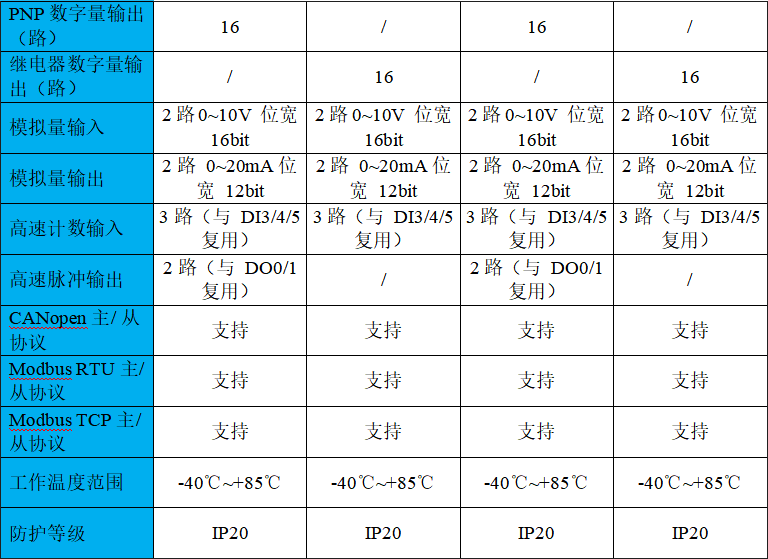 PNP數(shù)字量輸出16路DO 24V DC,輸出電流最大值為1A(單通道);繼電器輸出16路24V DC 3A/220V AC 5A;