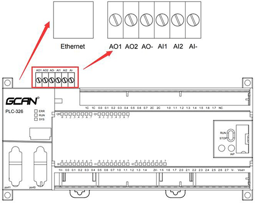 GCAN-PLC-326E/R系列的主控模塊含有一個(gè)以太網(wǎng)接口以及一組模擬量接口接線端子排,如圖所示。
