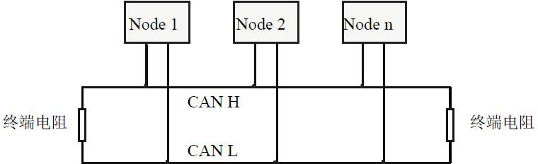 CAN-bus網(wǎng)絡(luò)采用直線拓?fù)浣Y(jié)構(gòu),總線最遠(yuǎn)的2個(gè)終端需要安裝120Ω的終端電阻;如果節(jié)點(diǎn)數(shù)目大于2,中間節(jié)點(diǎn)不需要安裝120Ω的終端電阻。對(duì)于分支連接,其長(zhǎng)度不應(yīng)超過3米。CAN-bus總線的連接如圖所示。