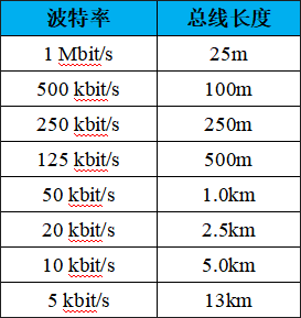 波特率與最大總線長(zhǎng)度參照表