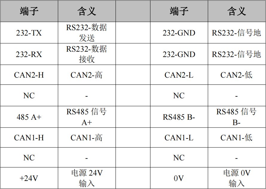 表2.1 GCAN-PLC-320/321/322的通信與供電接口定義