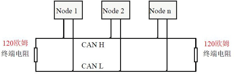 為了增強(qiáng)CAN通訊的可靠性,消除CAN總線終端信號(hào)反射干擾,CAN總線網(wǎng)絡(luò)最遠(yuǎn)的兩個(gè)端點(diǎn)通常要加入終端匹配電阻,如圖3.2所示。終端匹配電阻的值由傳輸電纜的特性阻抗所決定。例如雙絞線的特性阻抗為120Ω,則總線上的兩個(gè)端點(diǎn)也應(yīng)集成120Ω終端電阻。如果網(wǎng)絡(luò)上其他節(jié)點(diǎn)使用不同的收發(fā)器,則終端電阻須另外計(jì)算。