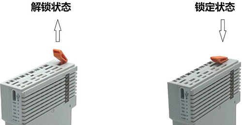 GCAN-PLC-425可編程邏輯控制器的鎖定和解鎖狀態(tài)如圖所示。當(dāng)模塊未安裝在導(dǎo)軌上時(shí),請(qǐng)將導(dǎo)軌鎖扣保持在鎖定狀態(tài),如長(zhǎng)時(shí)間處于解鎖狀態(tài),可能會(huì)導(dǎo)致鎖扣失效。