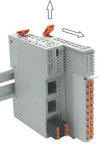 GCAN-PLC-425可編程邏輯控制器最多可以連接32個(gè)擴(kuò)展IO模塊。插入擴(kuò)展IO模塊時(shí),一定要沿著凹槽,在已有模塊的右側(cè)順次插入,再按下鎖扣并并發(fā)出“咔”的一聲。在整個(gè)節(jié)點(diǎn)的最右端,您需要安裝終端端子模塊,請(qǐng)注意終端模塊安裝方向。該終端可以保障GC-Bus的數(shù)據(jù)傳輸與電力供應(yīng)。終端模塊正確安裝方向如圖所示: