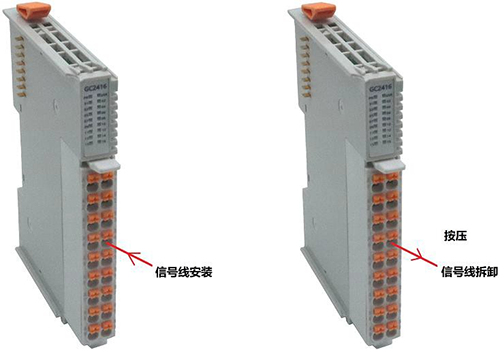 使用一字端子接頭的線纜,將端子接頭對(duì)準(zhǔn)相應(yīng)通道的圓孔插入即可;拆線時(shí),需使用一字螺絲刀,插入需拆線的通道旁對(duì)應(yīng)橘黃色方形孔,用力向下按壓,此時(shí)相應(yīng)圓孔中的夾片會(huì)松動(dòng),線纜即可輕松拔出。