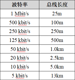 請(qǐng)注意:CAN-bus電纜可以使用普通雙絞線、屏蔽雙絞線。理論最大通信距離主要取決于總線波特率,最大總線長(zhǎng)度和波特率關(guān)系詳見下表。若通訊距離超過1km,應(yīng)保證線的截面積大于Φ1.0mm2,具體規(guī)格應(yīng)根據(jù)距離而定,常規(guī)是隨距離的加長(zhǎng)而適當(dāng)加大。