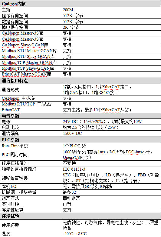 (1)1路EtherNet;1路EtherCAT;1路CAN;1路RS485;(2)編程軟件:OpenPCS/CodeSys(編程語言符合IEC61131-3標(biāo)準(zhǔn));(3)支持CANopen協(xié)議主/從站功能;(4)支持Modbus RTU/TCP主/從站功能;(5)支持EtherCAT主站功能;從站數(shù):最多10個(gè)EtherCAT從站;(6)組態(tài)方式為自動(dòng)組態(tài)形式;(7)電源采用24V DC;輸入電流最大為1A;(8)通信隔離為1500V DC;(9)工作溫度范圍:-40℃~+85℃;(10)防護(hù)等級(jí):IP20;(11)EMC抗干擾等級(jí):Zone B;(12)EMC抗干擾支持:供電通道、RS485通道、CAN通道。 - GCAN-PLC產(chǎn)品功能及應(yīng)用視頻: