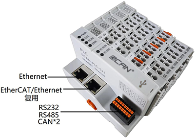 完整的GCAN-PLC控制器外觀如圖2.1所示。GCAN-PLC-521主控模塊包含總線通信接口、供電及I/O電源接口。其中,總線通信接口包括1個以太網(wǎng)接口、1個以太網(wǎng)/EtherCAT復(fù)用接口、1個RS232接口、1個RS485接口、2個CAN接口。編程接口使用以太網(wǎng)接口。