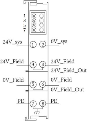 PLC主控模塊的電源接線端子排如圖2.8所示。PLC主控模塊包含8個端子,各個端子對應(yīng)的序號及其含義如表2.2所示。請注意,3號端子與4號端子之間、5號端子與6號端子之間、7號端子與8號端子之間,在模塊的內(nèi)部是相連的。