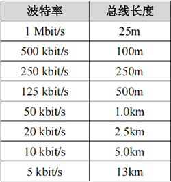 請注意:CAN-bus電纜可以使用普通雙絞線、屏蔽雙絞線。理論最大通信距離主要取決于總線波特率,最大總線長度和波特率關(guān)系詳見表3.1。若通訊距離超過1km,應(yīng)保證線的截面積大于Φ1.0mm2,具體規(guī)格應(yīng)根據(jù)距離而定,常規(guī)是隨距離的加長而適當(dāng)加大。